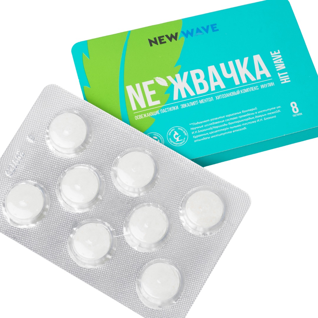 Освежающие пастилки «NE’Жвачка» со вкусом эвкалипта и ментола из серии инновационных продуктов «HIT WAVE» с пребиотиками и хитозановым комплексом — это лучшая альтернатива жевательной резинке и конфетам для длительной свежести дыхания, поддержания здоровья зубов и полости рта!
